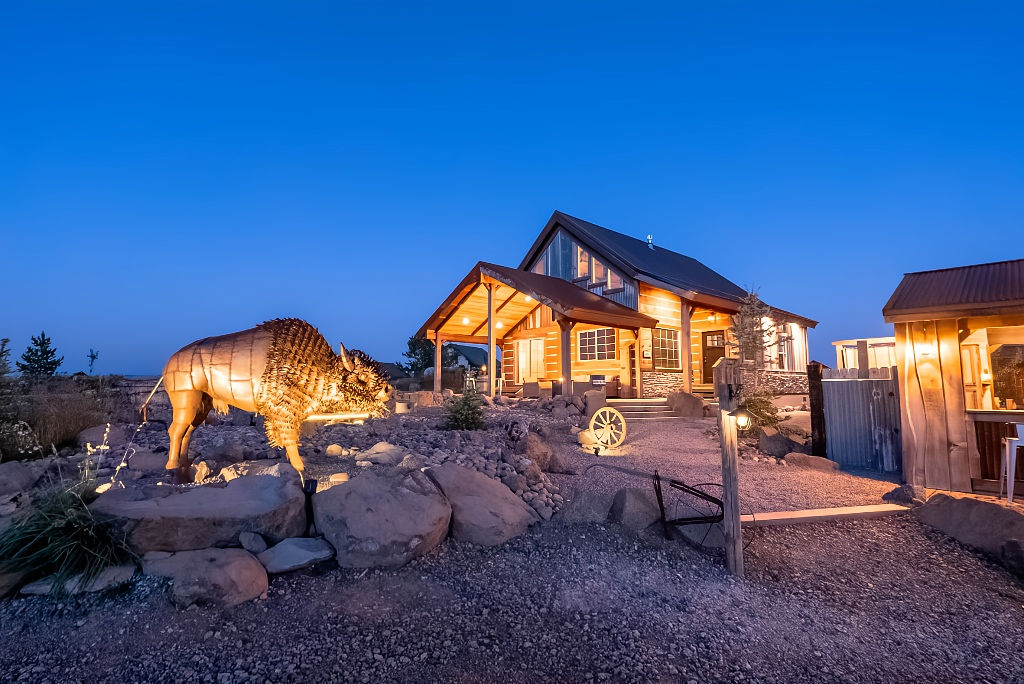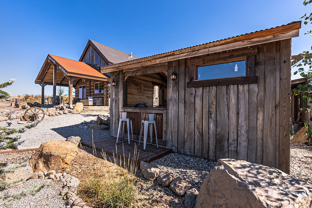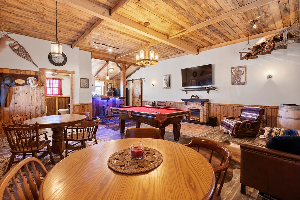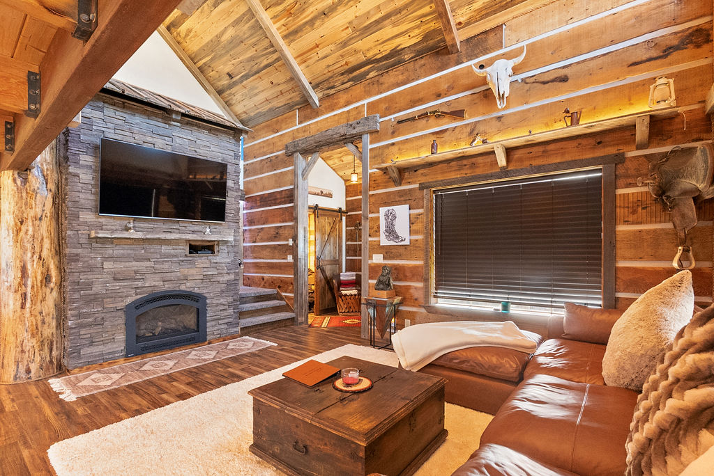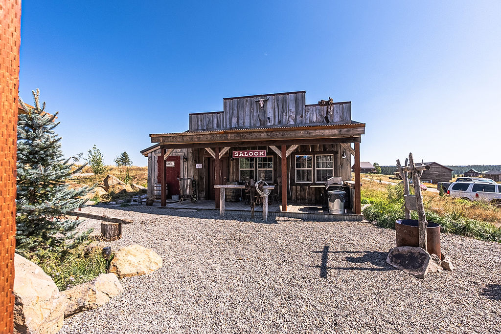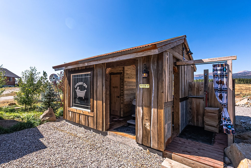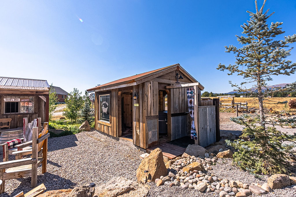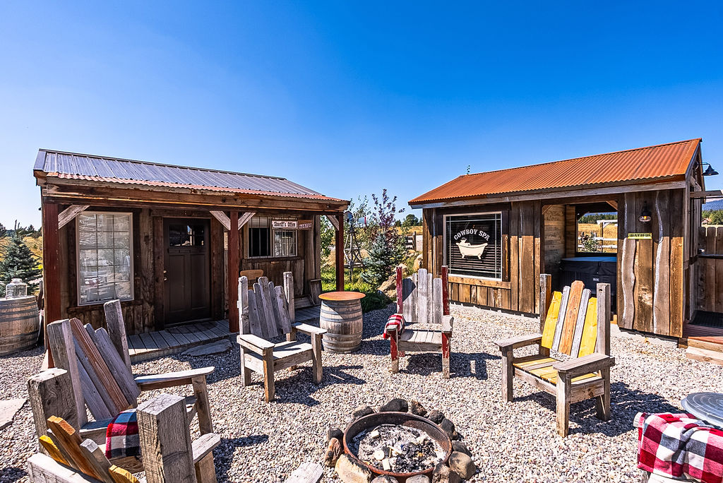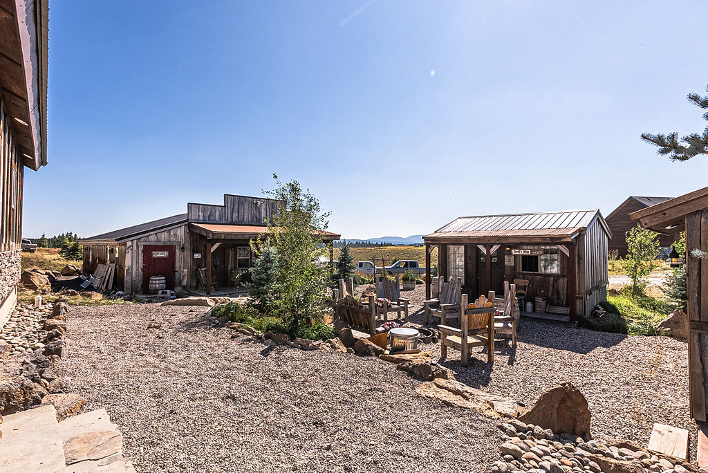The lodge sits on approximately 1.6 acres of land, creating an atmosphere that resembles a small western town from days past. Authentic reclaimed building materials are used for the main house and outbuildings, providing guests with a truly rustic feel. An outdoor campfire pit and a small pond add to the charm of the property, which is surrounded by lush nature and beauty.