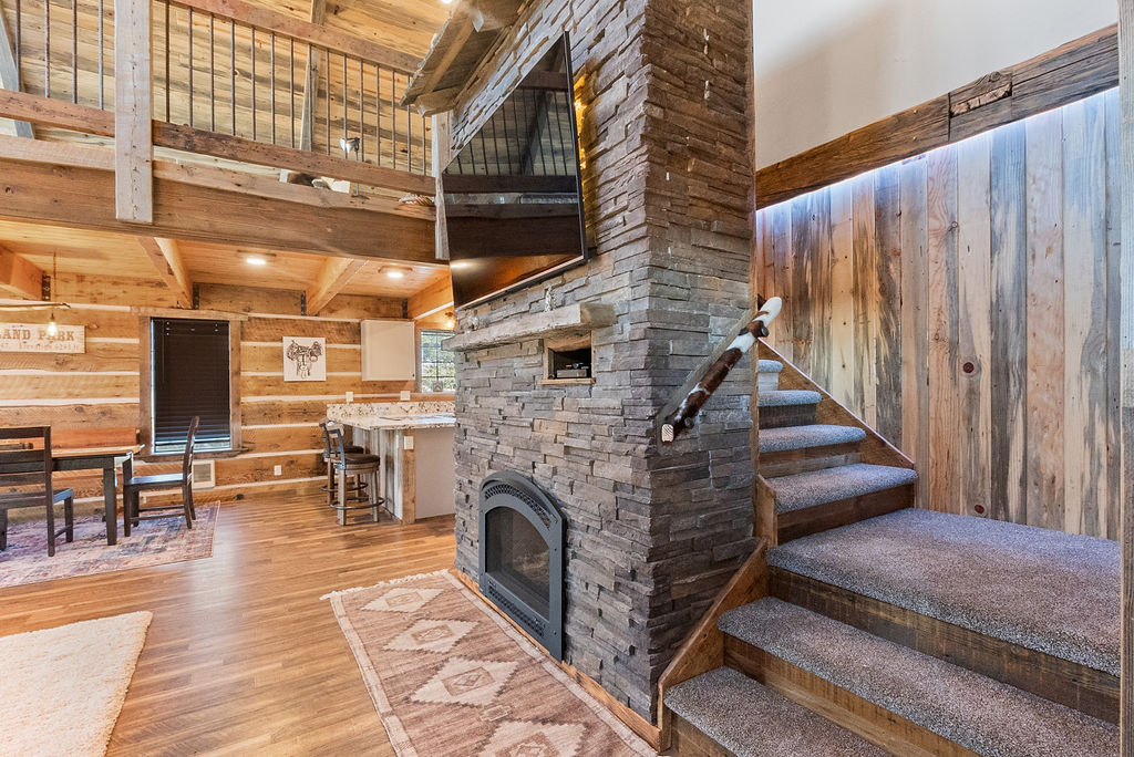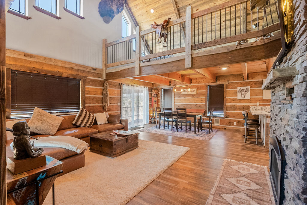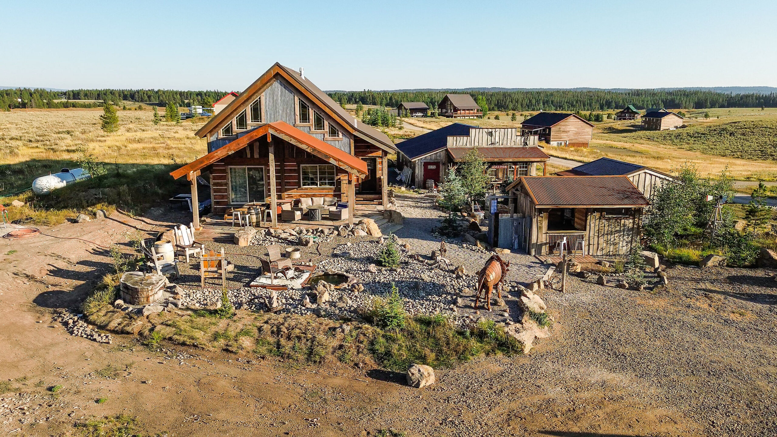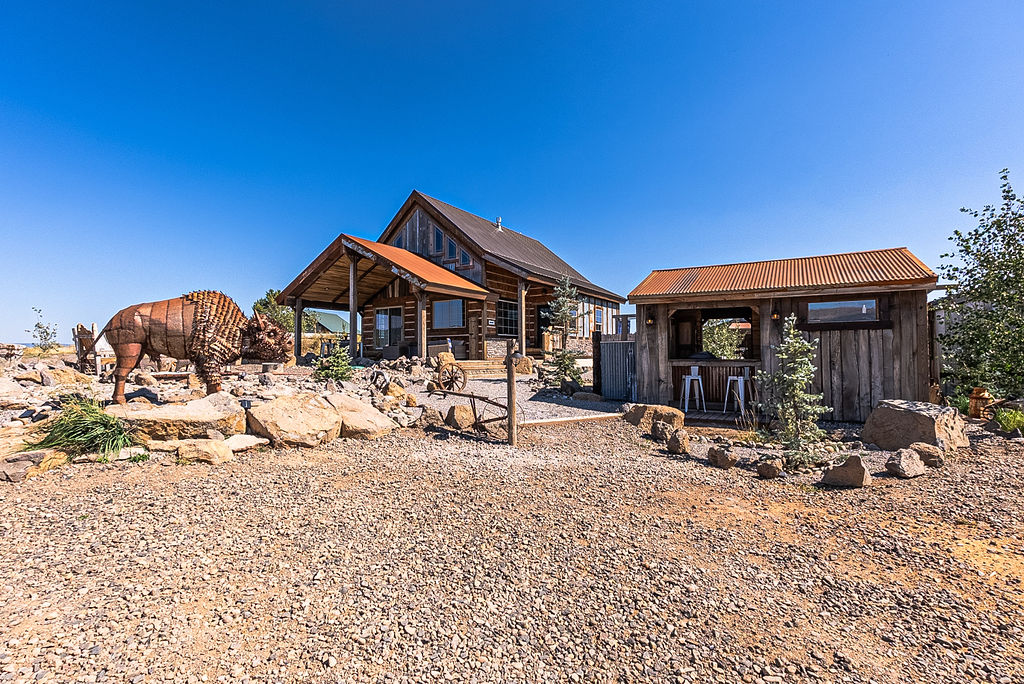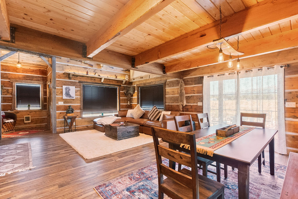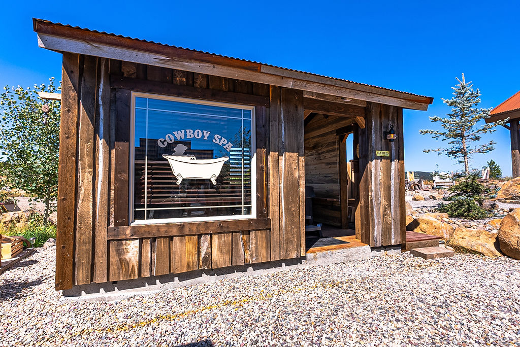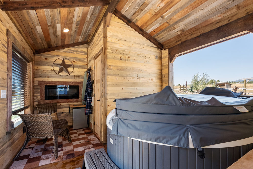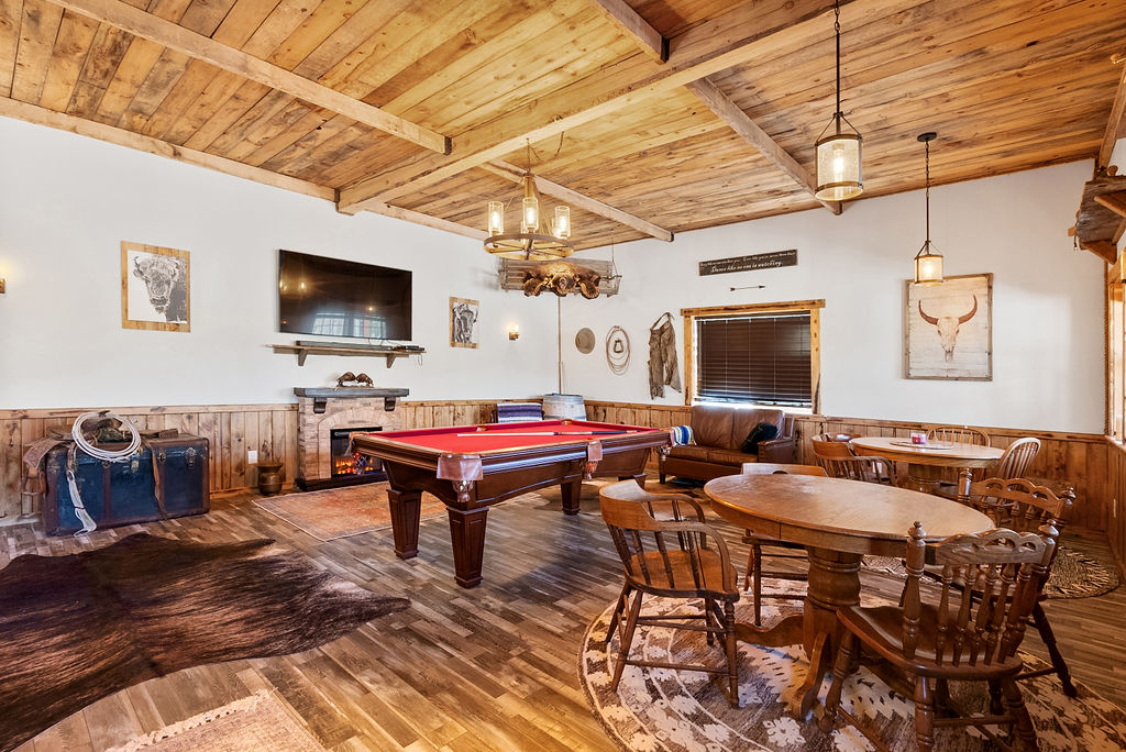 The lodge sits on approximately 1.6 acres of land, creating an atmosphere that resembles a small western town from days past. Authentic reclaimed building materials are used for the main house and outbuildings, providing guests with a truly rustic feel. An outdoor campfire pit and a small pond add to the charm of the property, which is surrounded by lush nature and beauty.