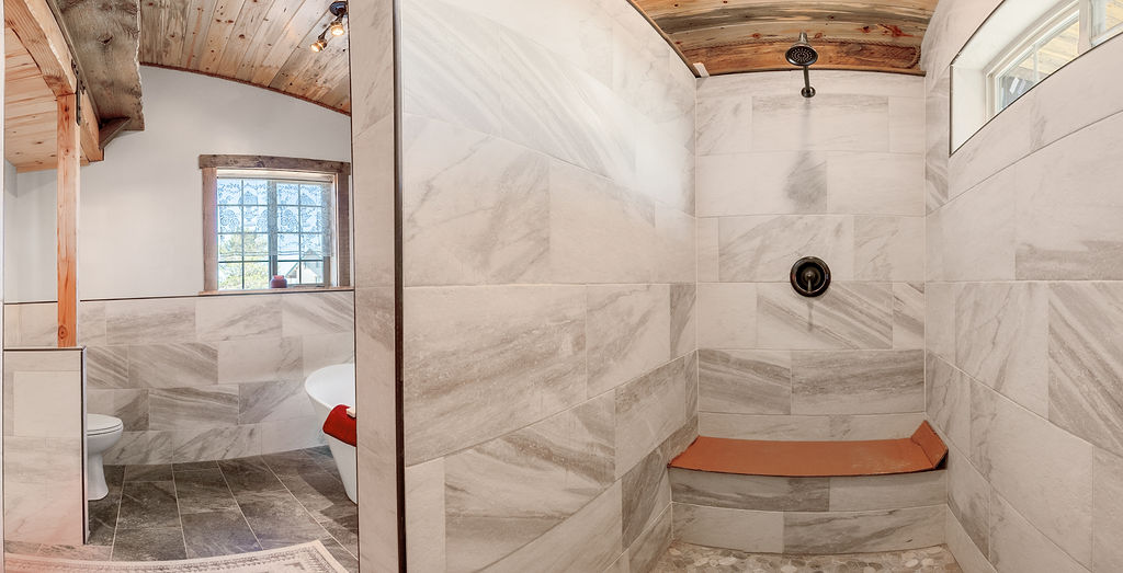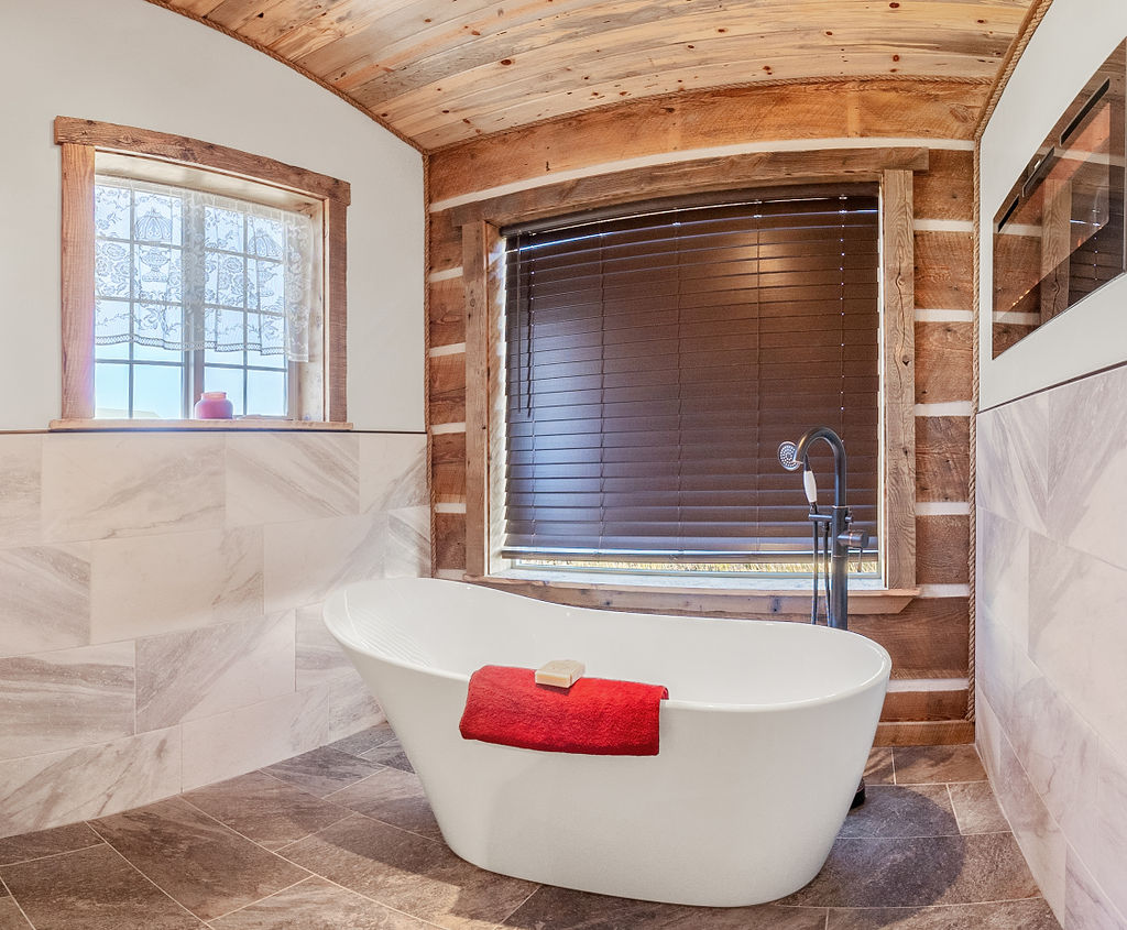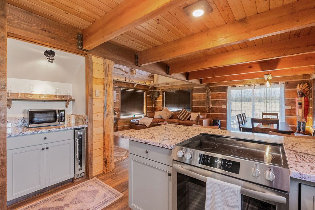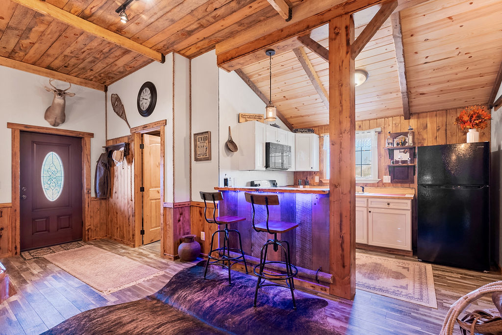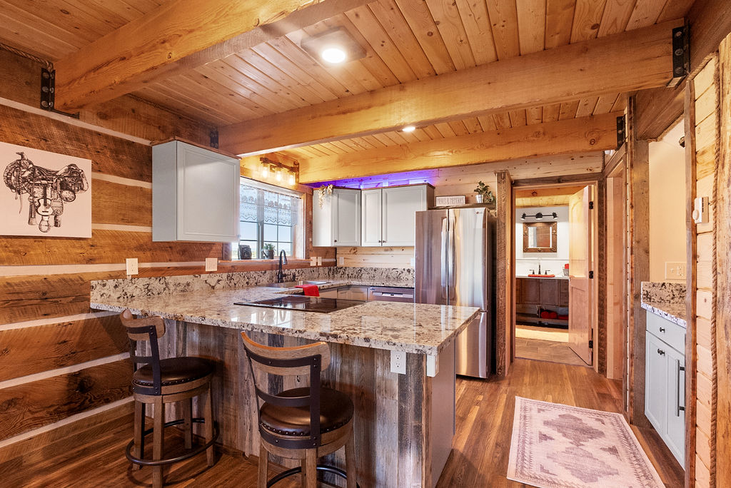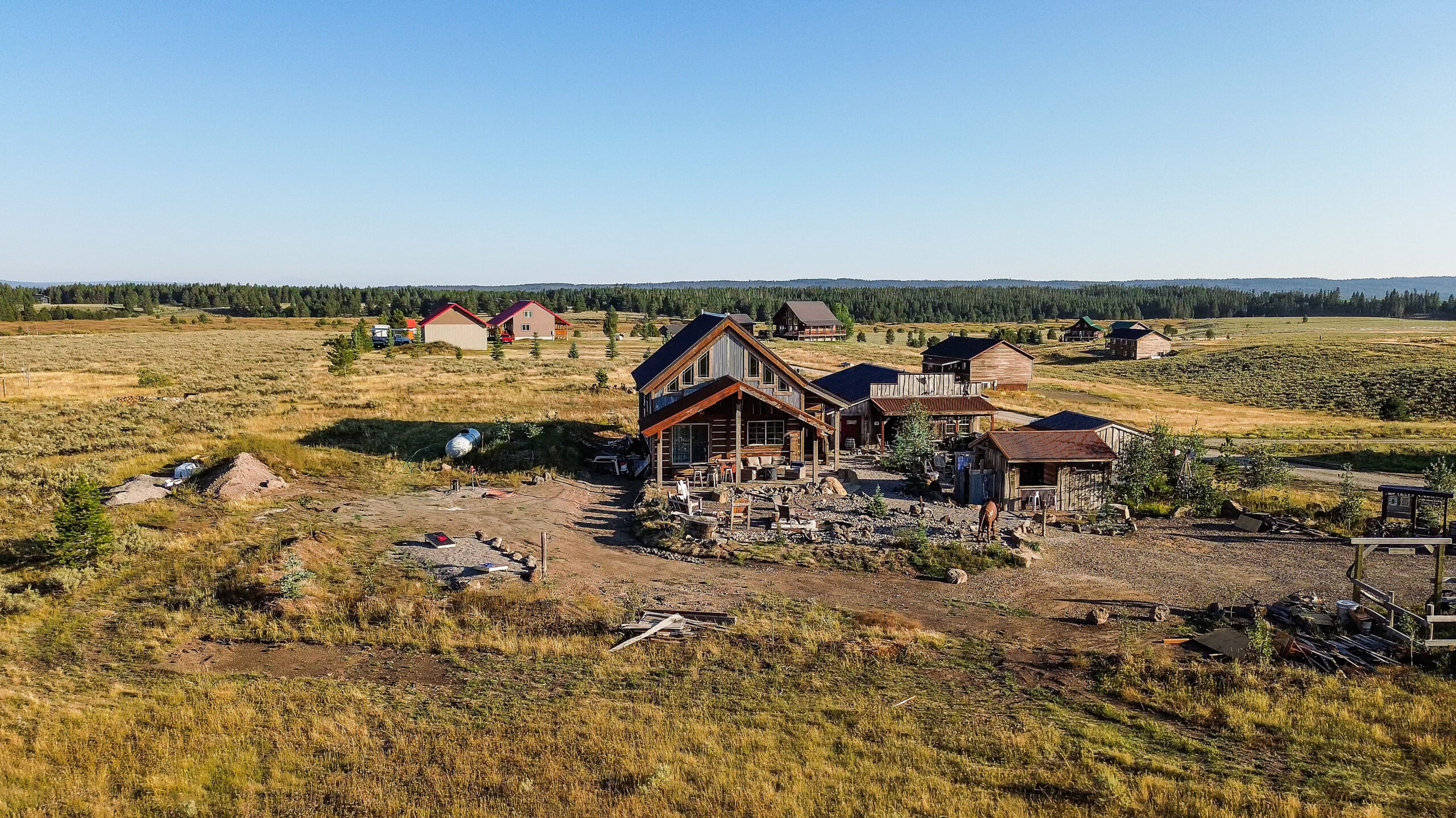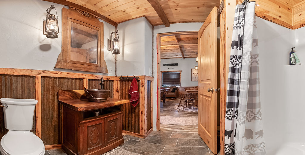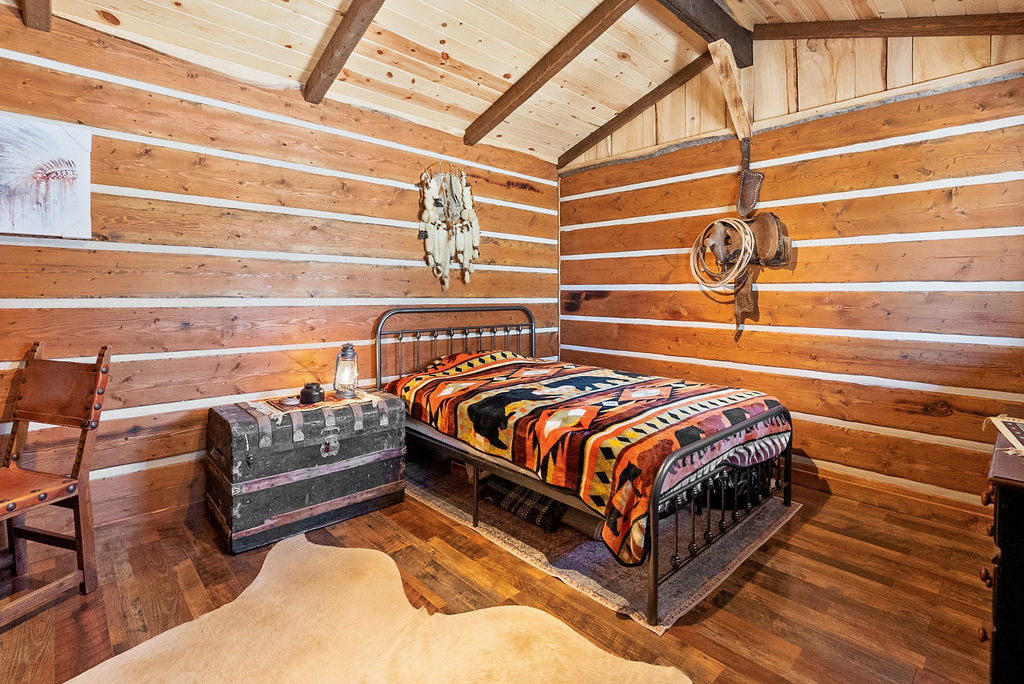 The lodge sits on approximately 1.6 acres of land, creating an atmosphere that resembles a small western town from days past. Authentic reclaimed building materials are used for the main house and outbuildings, providing guests with a truly rustic feel. An outdoor campfire pit and a small pond add to the charm of the property, which is surrounded by lush nature and beauty.